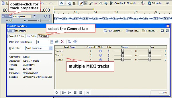 As you may know, one track in ACID can contain multiple MIDI tracks. Each MIDI track can control a separate MIDI instrument on its own MIDI channel. Because of this, ACID cannot allow you to assign MIDI patch information at the ACID track level because there is no way of knowing which MIDI track to send it to.