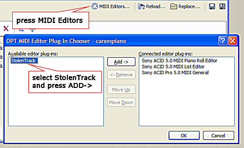 Press the MIDI Editors button and select StolenTrack from the list on the left, and press Add-> to add it to the list on the right. Then press OK and close theTrack Properties dialog. We are done with this track.