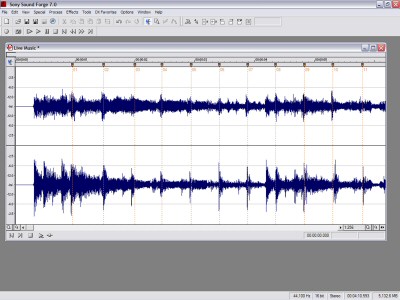 Open the wave file in Sound Forge. I like to start by mapping the tempo of the file with Markers. To do this, play the file and tap the ‘M’ key on each beat. Do this for a few measures to give you a visual cue of the beats in each measure.