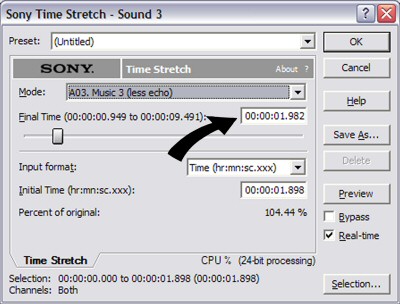 This new wave is just temporary. We are only using it as a scratch pad for doing the time stretching. On this new wave select Process > Sony Time Stretch….In the Time Stretch dialog either change Input format to Tempo (bpm) and enter the beats per minute of the final song, or change the Final Time to match the length of the first measure. All of the subsequent measures will be adjusted to this time. Press OK to time stretch.