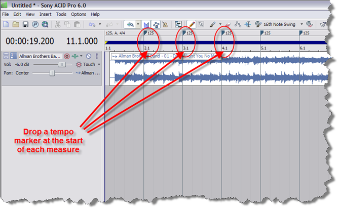 What do you do when you want to add ACID loops to a live song? The problem with live music is that is usually not performed to a “click-track” and the tempo drifts so that the ACID Beatmapper cannot be used. The answer is simple. What you need to do is something I call “Tempo Mapping”. Unlike beatmapping which adjusts the tempo of the song to match the project, tempo mapping adjust the tempo of the project to match the changes in the live feel of the song.