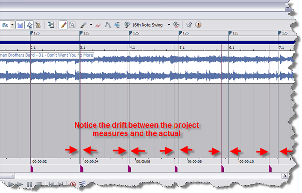 Look at how the distance between the Tempo Markers which are set to the first beat of each measure, and the Time Markers which are the actual downbeats drift further apart over time. You can actually see the tempo drift!