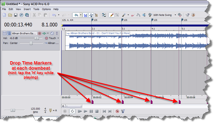 Next drop a Tempo Marker (T) at each measure if the song. These temp markers will be used to map each measure to match the live feel of the song (hence the term “tempo mapping”)