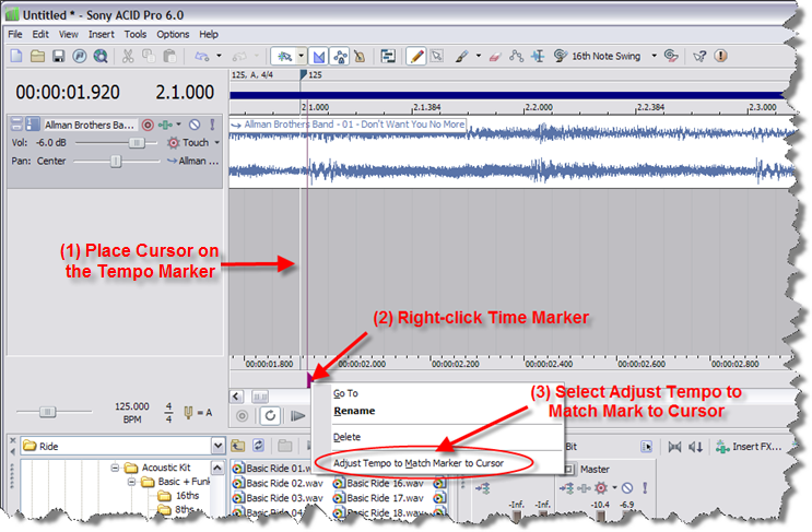 What do you do when you want to add ACID loops to a live song? The problem with live music is that is usually not performed to a “click-track” and the tempo drifts so that the ACID Beatmapper cannot be used. The answer is simple. What you need to do is something I call “Tempo Mapping”. Unlike beatmapping which adjusts the tempo of the song to match the project, tempo mapping adjust the tempo of the project to match the changes in the live feel of the song.